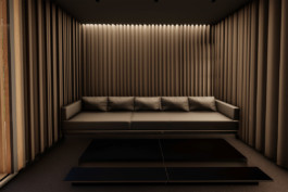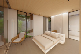 The interior is characterized by the duality and contrast of materials, textures and colors, as well as a monolithic and minimalistic design. The combined use of minerals and wood on the floors and under the vast roof overhangs make for a contemporary ambiance. The textures alternate from smooth to granular and the light-colored mineral elements contrast with the natural colors of wood, which makes for a sleek and warm tropical house.