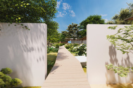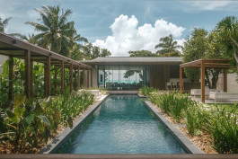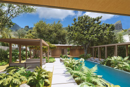 With a unique layout and geometry, this residential villa is designed as a succession of modules and sequences. The architectural journey progresses through diverse landscaping ambiances showcasing the beauty of the natural site: first the entry area with a garage and an office, then the guests' house and, finally, the main villa facing the lagoon. The building design features sleek lines and generous roof overhangs, which contribute to the general impression of refinement and simplicity of the architectural design. Landscape design by Paysages Tahiti.